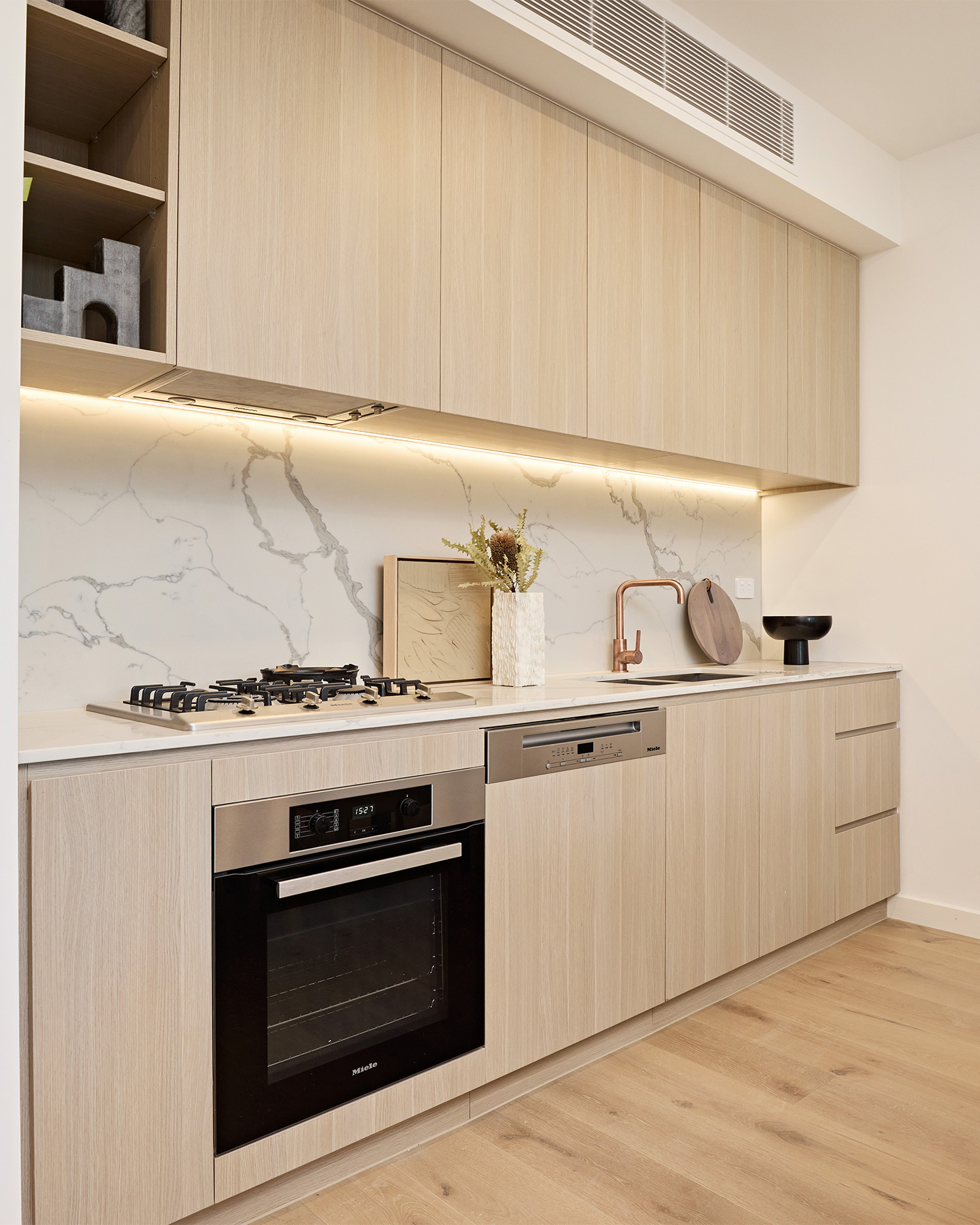 The designer kitchens feature Miele appliances, stone waterfall benchtops, and ample storage, while the spacious living areas open to the entertainer balconies, inviting natural light and the outdoors inside.